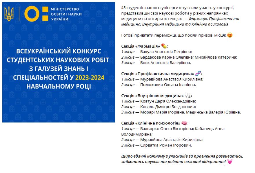 The members of the student`s scientific club of The Department of Pharmacy and Industrial Technology of Drugs submitted 2 works for participation in the All-Ukrainian competition of student`s scientific works in the fields of knowledge and specialties: