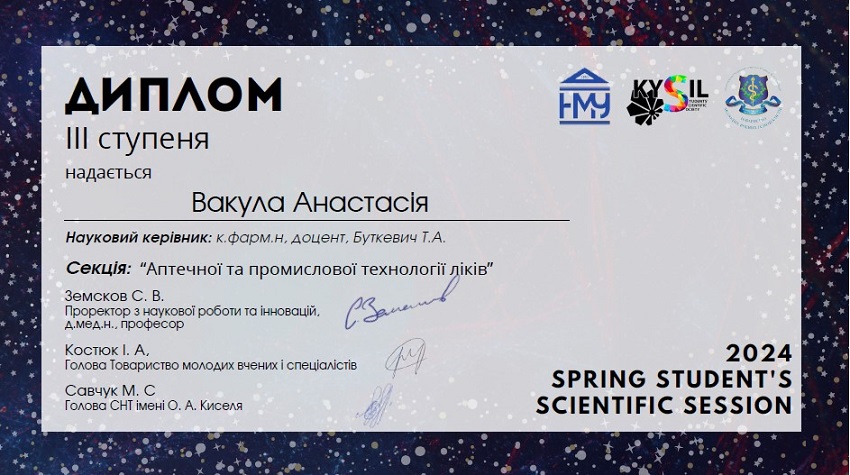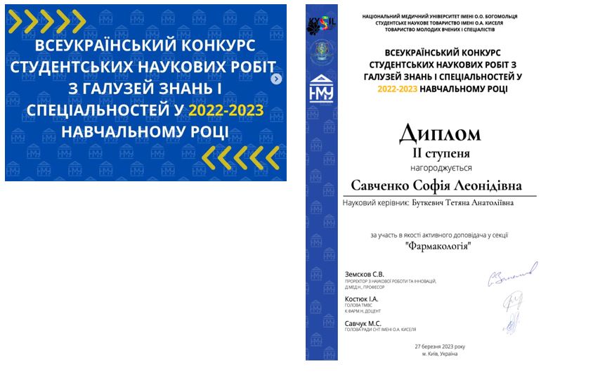 Both works were recognised as winners in the Pharmacy section and awarded with first degree diploma (Anastasiia Vakula) and second degree diploma (Kateryna Mykhailova).