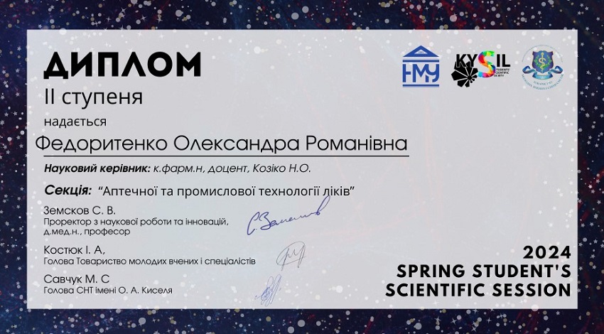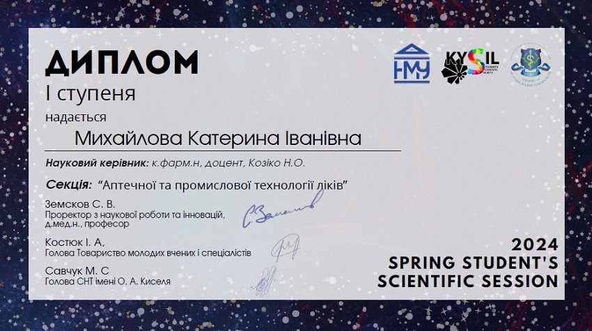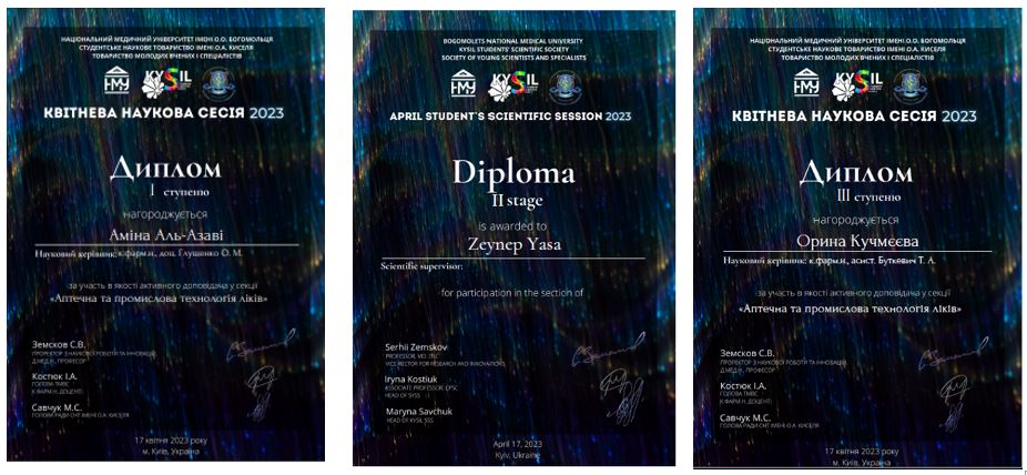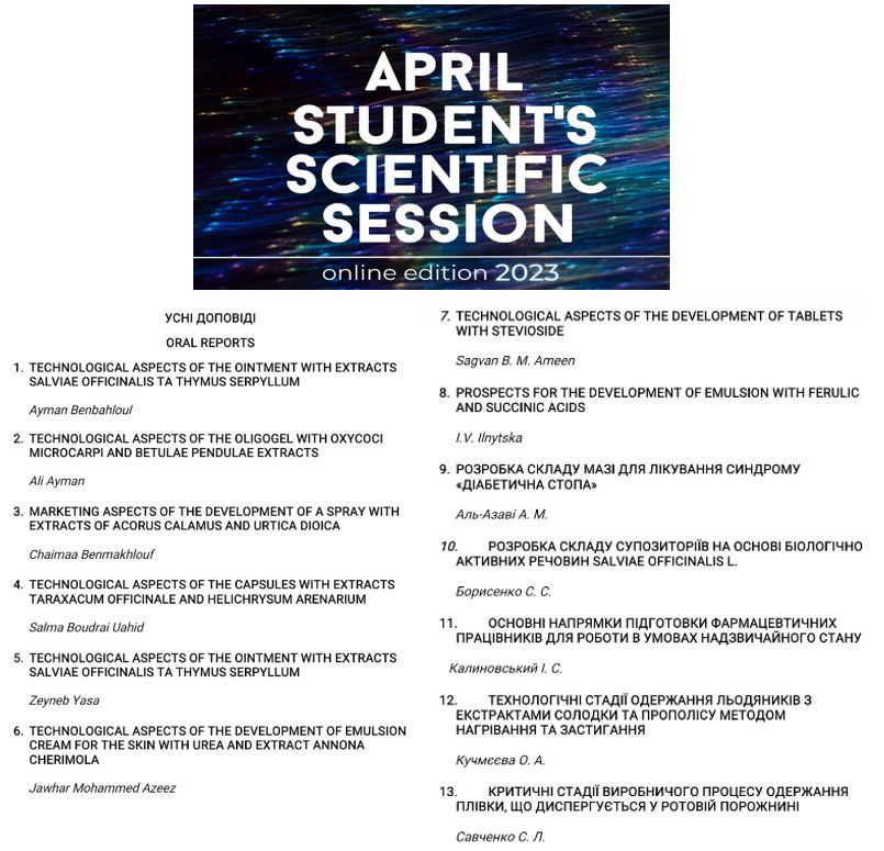 As part of the April Student`s Scientific Session 2023 (online edition), on 17 April 2023, students of The Department of Pharmacy and Industrial Technology of Drugs of the Faculty of Pharmacy and the Faculty of Foreign Citizens presented 13 reports in English and Ukrainian in a separate section “Pharmacy and Industrial Technology of Drugs”. The students` works were recognised as winners: