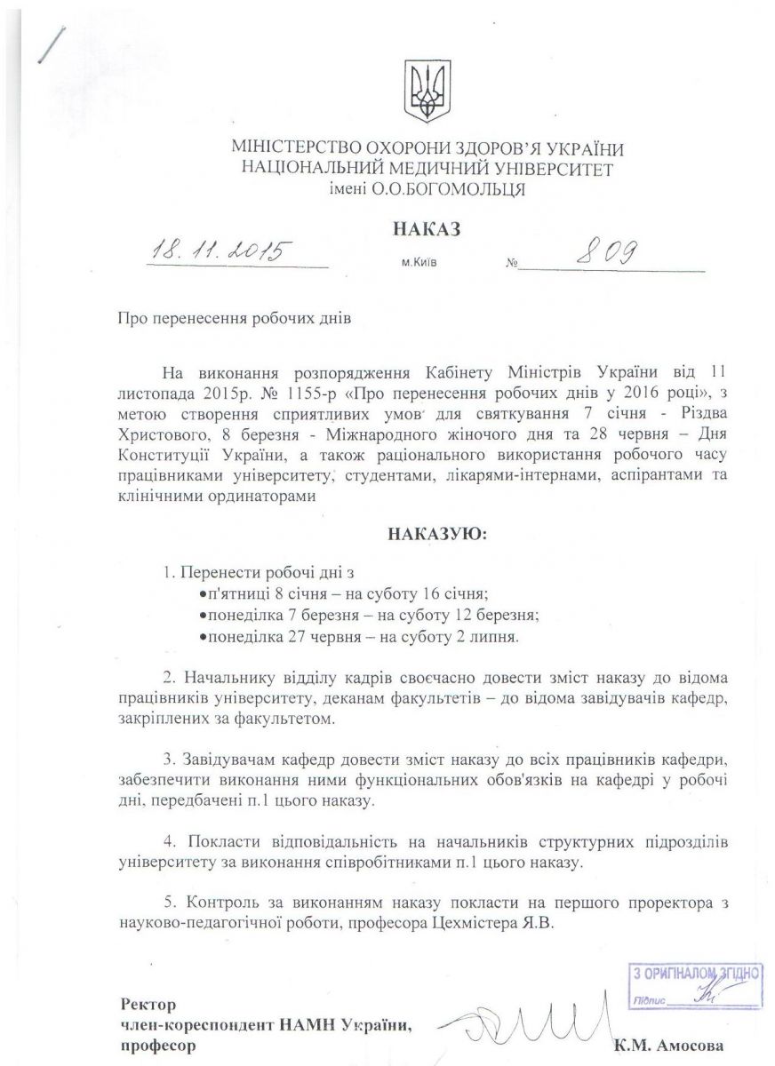 НАКАЗ ПРО ПЕРЕНЕСЕННЯ РОБОЧИХ ДНІВ