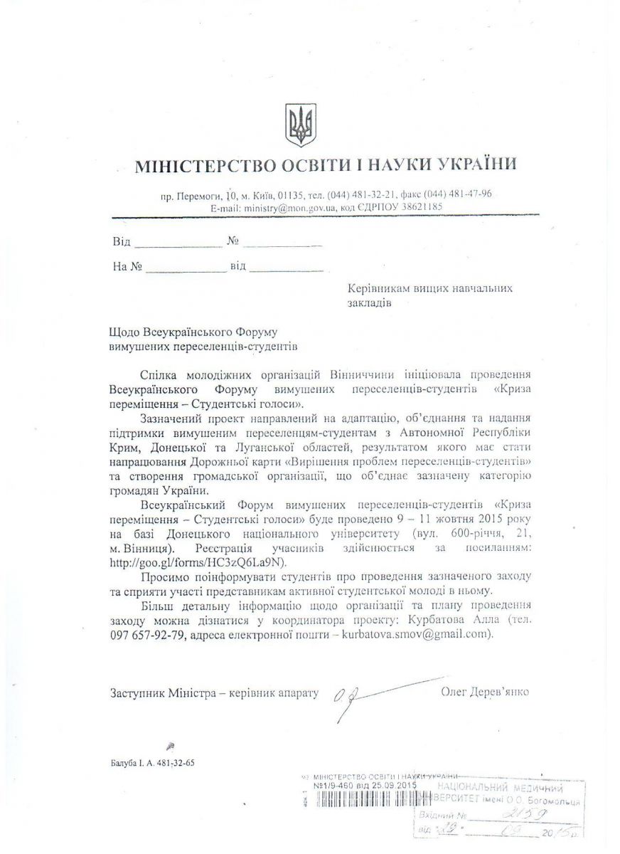 ЩОДО ВСЕУКРАЇНСЬКОГО ФОРУМУ ВИМУШЕНИХ ПЕРЕСЕЛЕНЦІВ-СТУДЕНТІВ