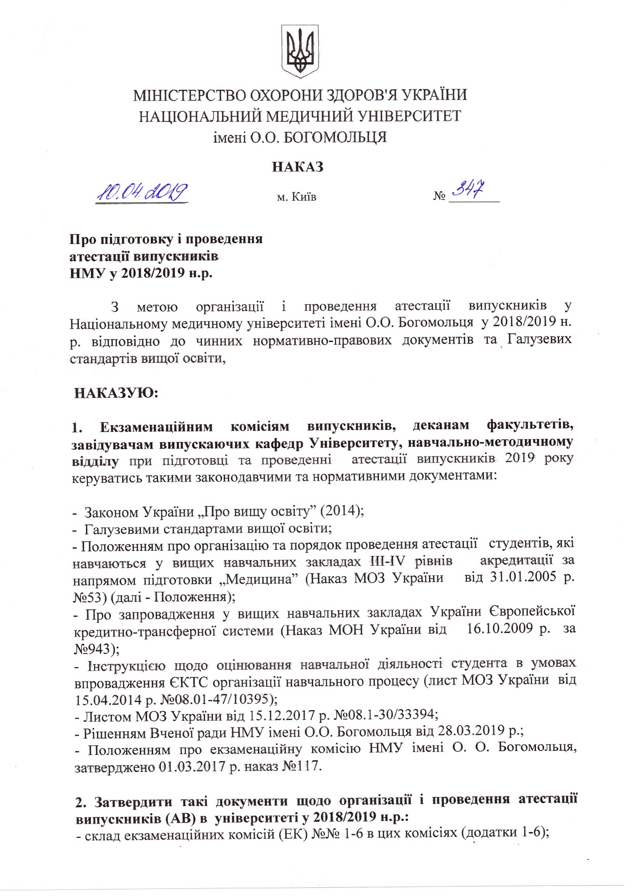 Про підготовку і проведення атестації випускників НМУ у 2018/2019 н.р.