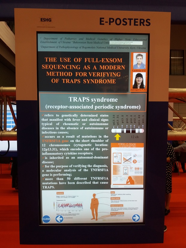 Співробітник Національного медичного університету імені О.О. Богомольця доцент кафедри патофізіології Анцупова Віта Вячеславівна прийняла участь у 52-й Міжнародній конференція з генетики людини що відбулася 16-18 червня у м. Гетеборг, Швеція. Конференція організована Європейським товариством з генетики людини. В роботі конференції приймали участь вчені, експерти та практичні лікарі різних галузей генетики людини зі всього світу. Науковцем університету було представлено доповідь «The use of Full-Exsom Sequencing as a modern method for verifying of TRAPS syndrome». В межах конференції було проведено конкурс студентських робіт «European DNA Day Essay Contest 2019», в якому Віта Вячеславівна прийняла участь, як суддя-рецензент.