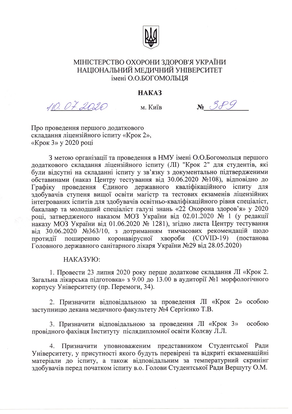 Про проведення першого додаткового складання ліцензійного іспиту “Крок 2”, “Крок 3” у 2020 році.